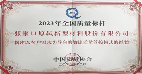 2023年12月,張家口原軾新型材料股份有限公司憑借 “構(gòu)建以客戶需求為導(dǎo)向的敏捷質(zhì)量管控模式的經(jīng)驗”,榮獲2023年全國質(zhì)量標(biāo)桿企業(yè)。